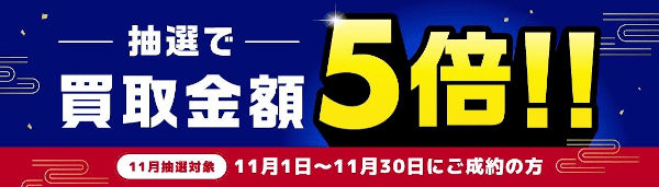 では、2025年11月1日〜30日の期間中に買取金額が1回のご利用で5,000円以上ご成約した方の中から抽選で最大25名様に買取金額が5倍になるキャンペーンを実施中です。